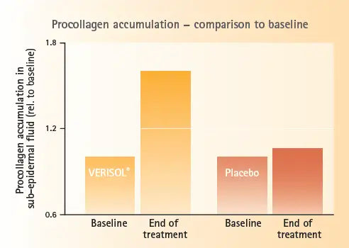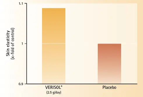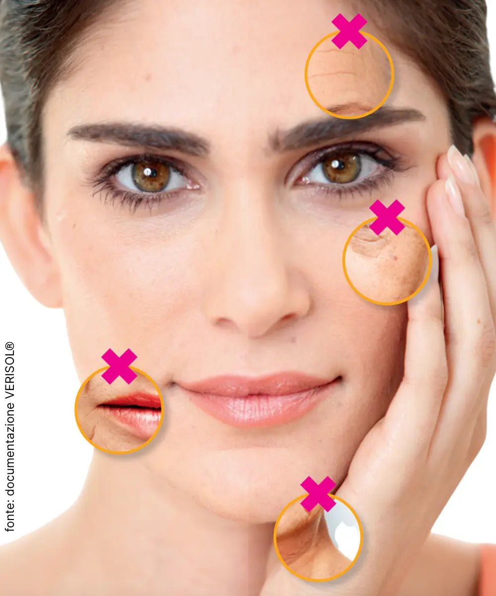 Su oltre 100 donne tra 45 e 65 anni l'assunzione di 2,5 g/die di VERISOL® ha diminuito significativamente le rughe in 4 settimane e aumentato fino al 60% la concentrazione di collagene.