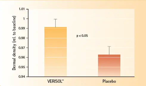 Uno studio su 105 donne tra 25-50 anni ha mostrato che 6 mesi di integrazione con 2,5 mg/die di VERISOL® ha aumentato la densità del derma e ridotto in modo significativo l’irregolarità superficiale della pelle.