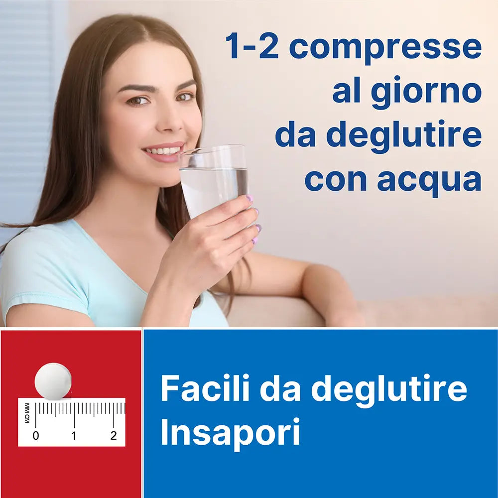 Assumere 2 compresse al giorno, preferibilmente lontano dai pasti, da deglutire con un bicchiere d’acqua.