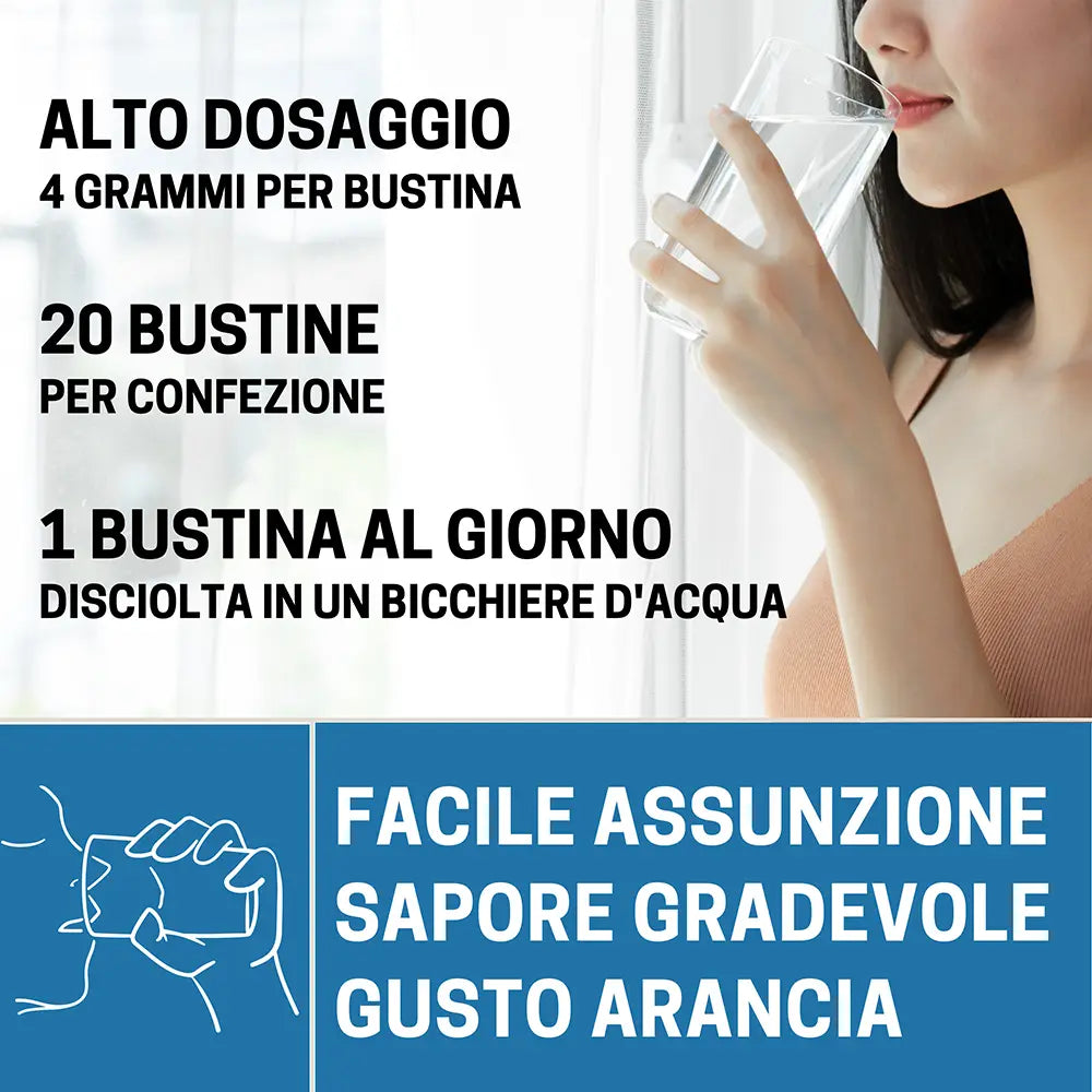 Si consiglia l’assunzione di 1 bustina al giorno, da sciogliere in un bicchiere d’acqua (circa 150-200 ml).