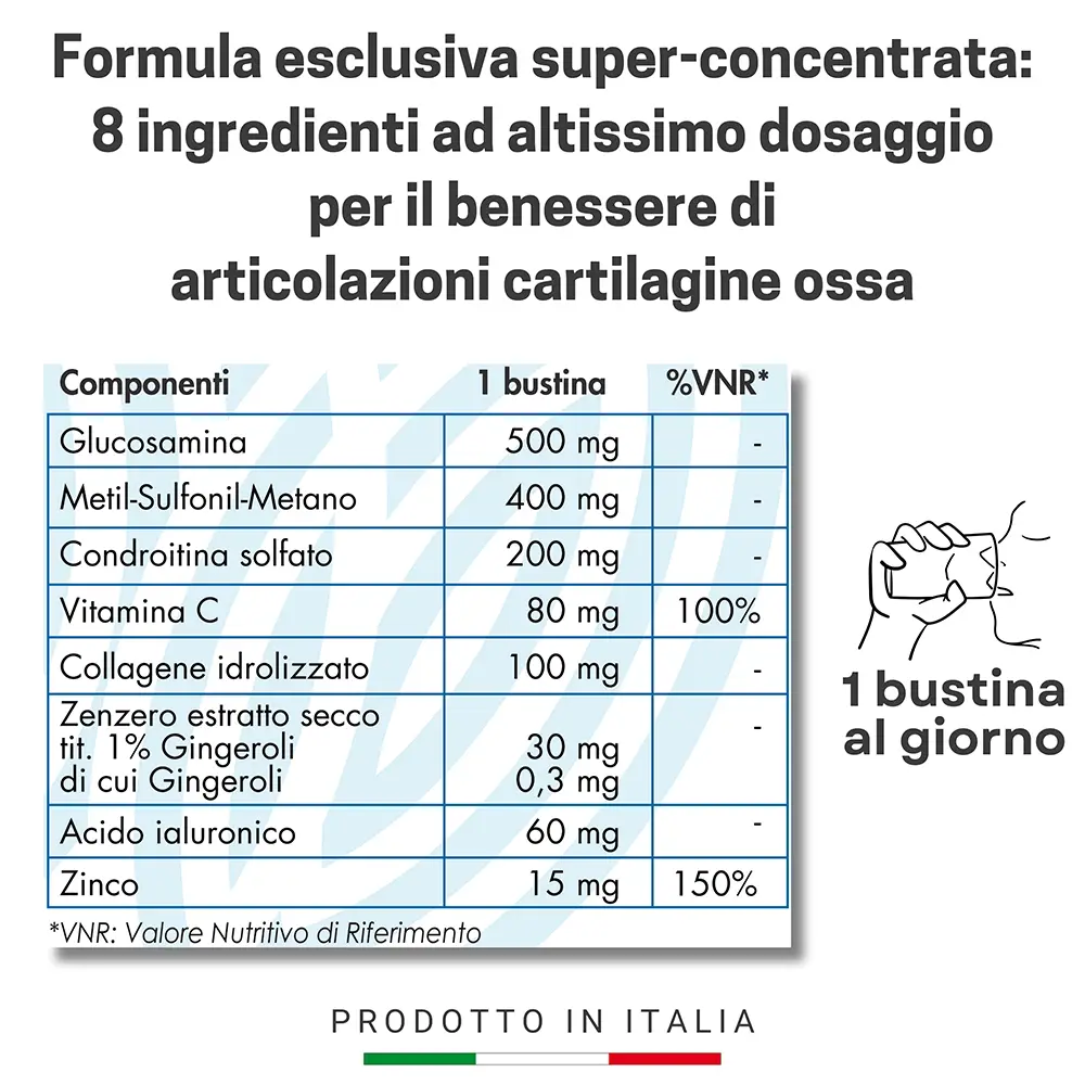 Contiene la più ricca combinazione sul mercato di attivi per il benessere articolare: ben 8 ingredienti, perfettamente sinergici, e in alti dosaggi.