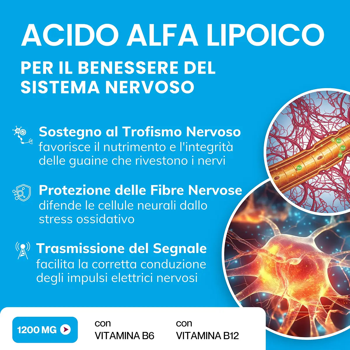 La dose massima giornaliera (2 compresse) apporta 1200 mg di Acido Alfa Lipoico insieme a Vitamina B6 e B12, garantendo un supporto metabolico completo.