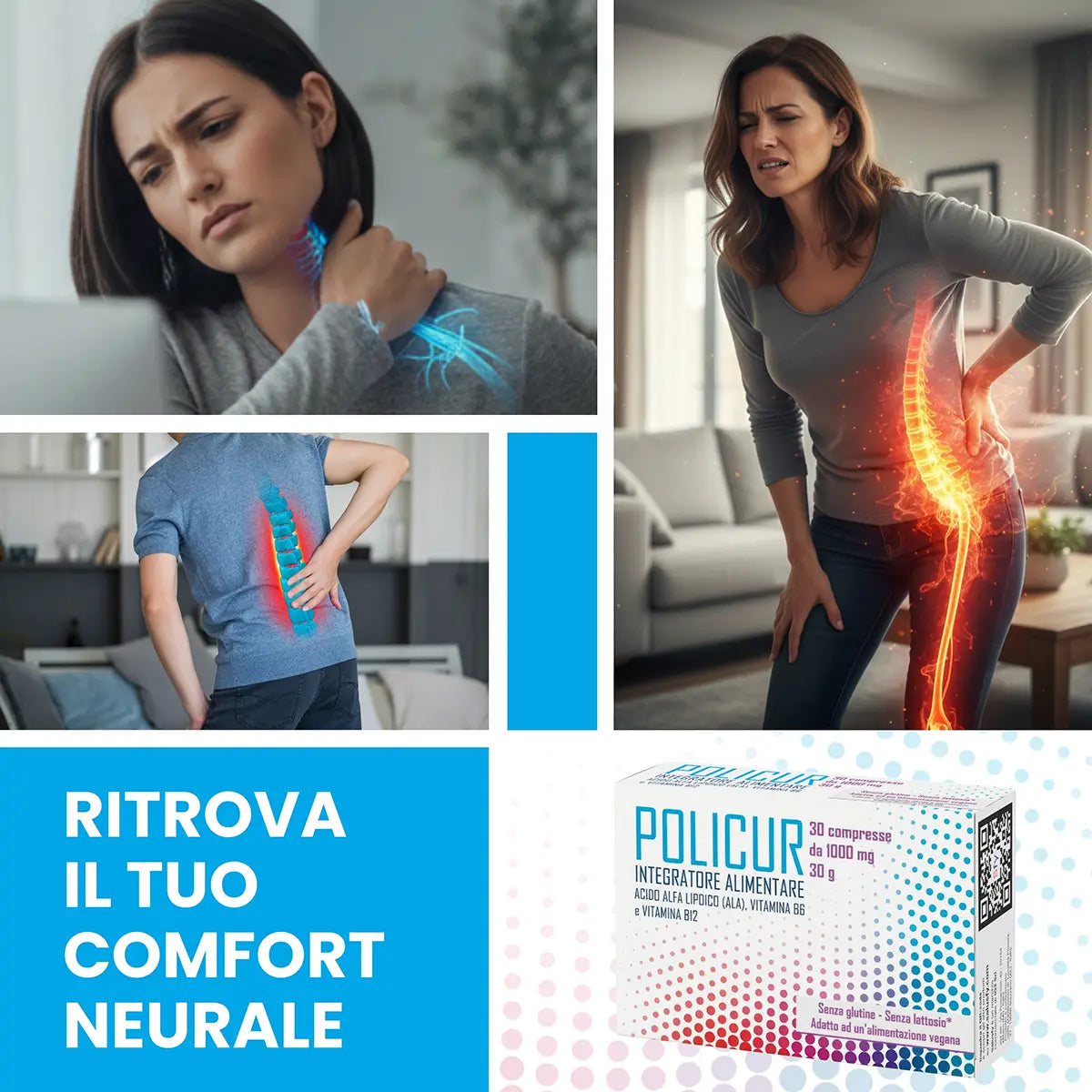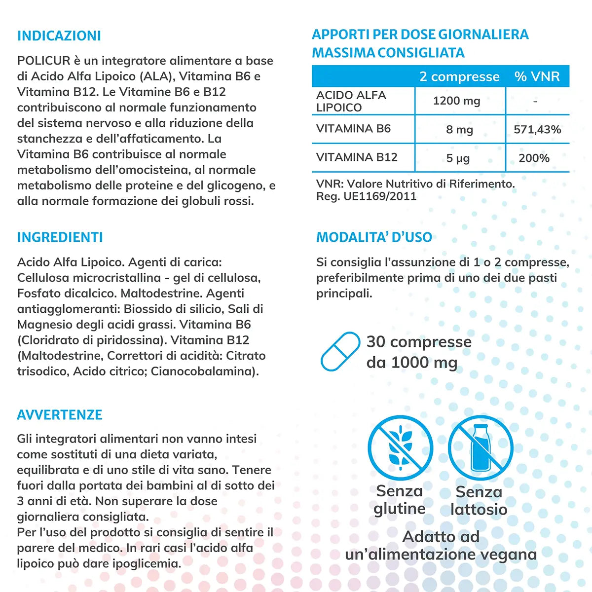 POLICUR è un integratore alimentare a base di Acido Alfa Lipoico (ALA), Vitamina B6 e Vitamina B12.