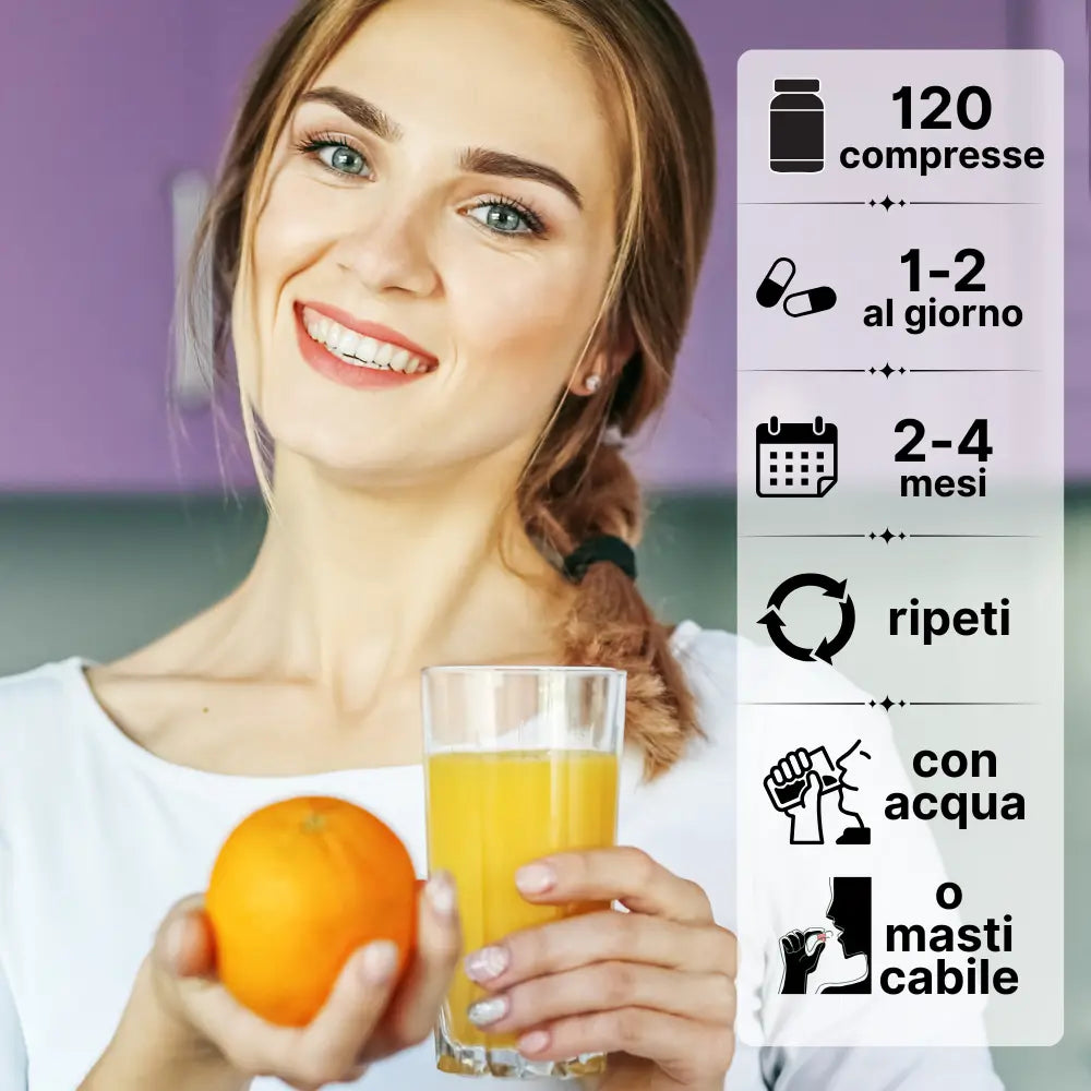 Puoi scegliere tra 500 o 1000 mg al giorno: una compressa nei periodi di mantenimento, due nei momenti di stress o affaticamento.